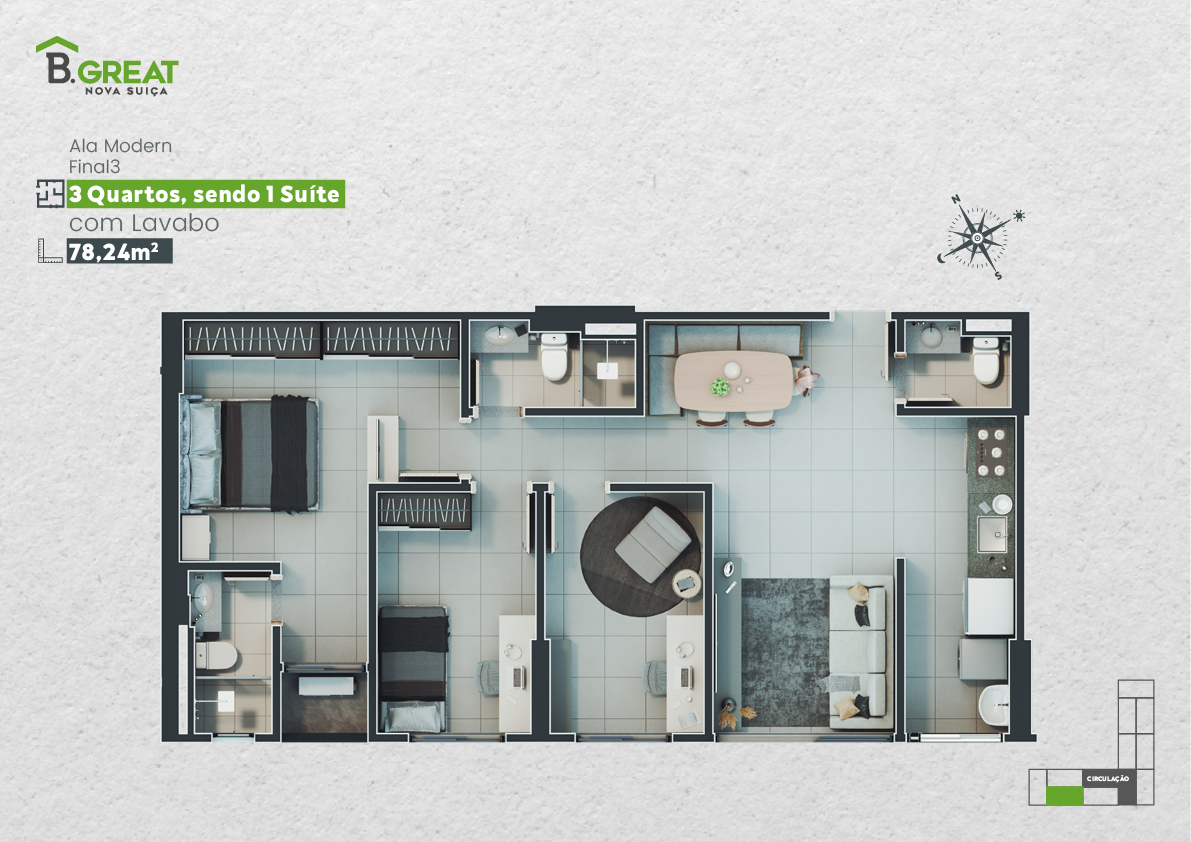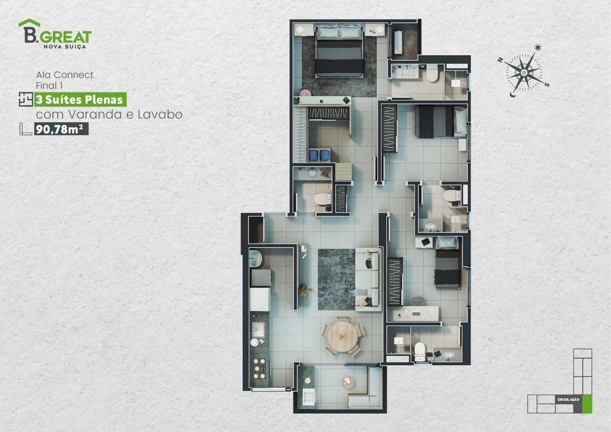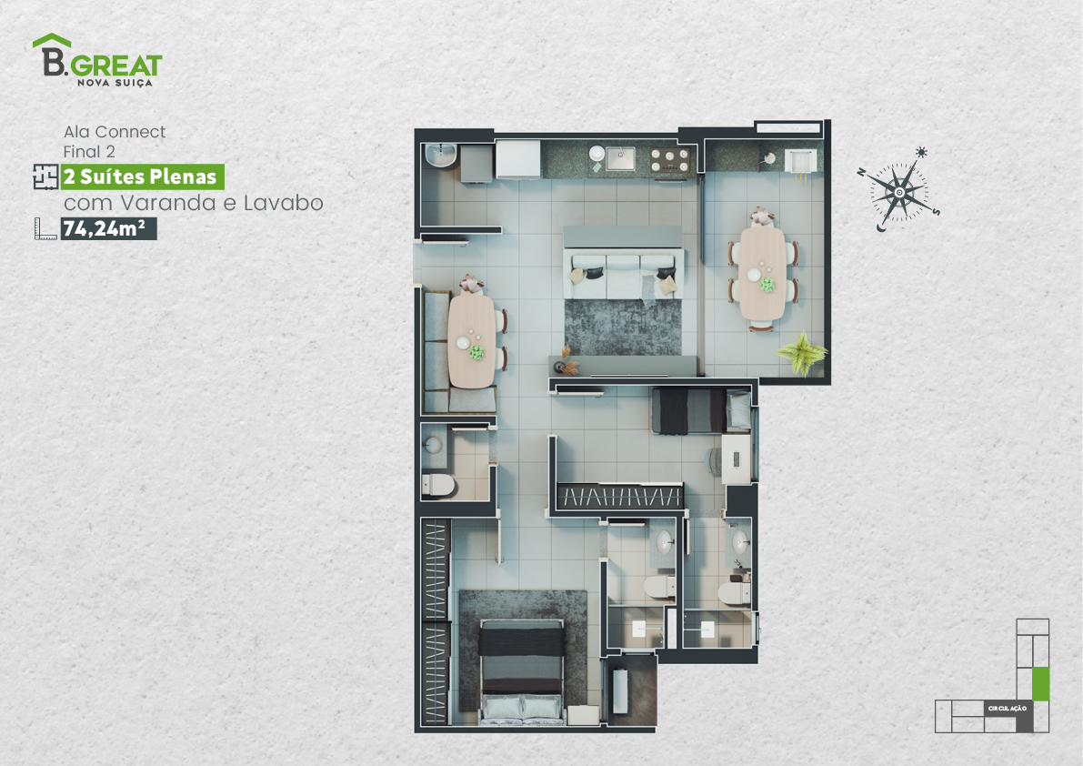 Faça o tour virtual e conheça o apartamento decorado de 74m² do B.Great Nova Suíça.