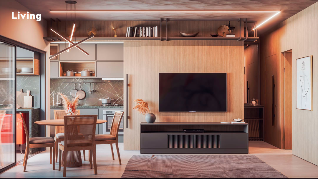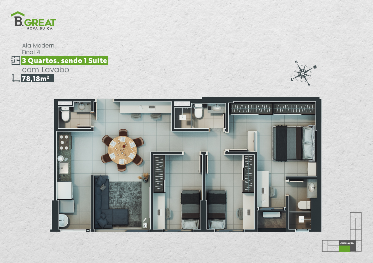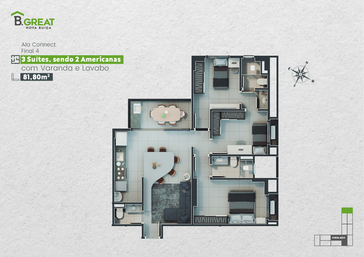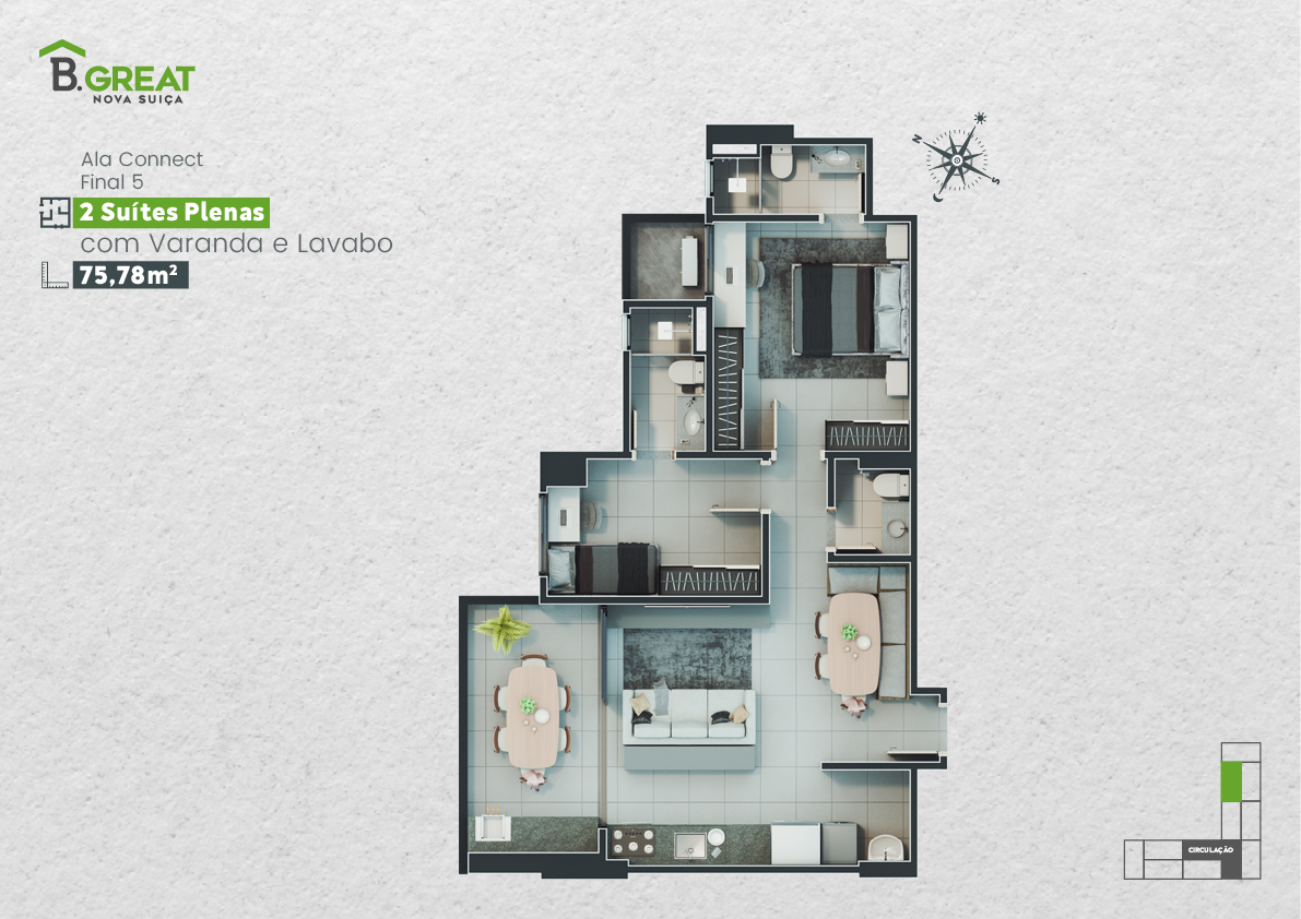 Faça o tour virtual e conheça o apartamento decorado de 74m² do B.Great Nova Suíça.